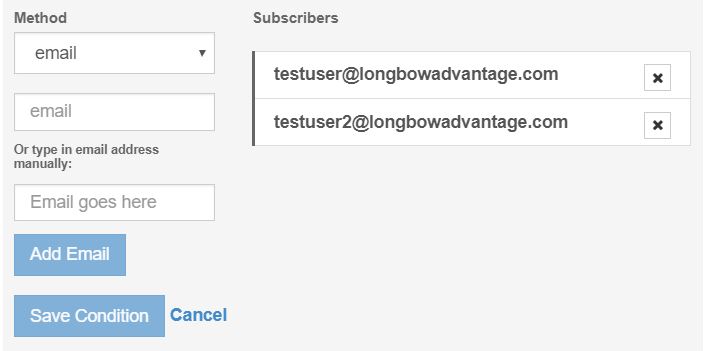 Set up the email and SMS subscriber lists for this notification. If the alert condition is triggered, an alert notification email will be sent to each user in the email subscribers list and an alert notification SMS will be sent to the mobile phone number of each user in the SMS subscribers list. The text of an alert notification SMS matches that of the alert notification email. Only Rebus user accounts can be added to SMS subscriber lists.