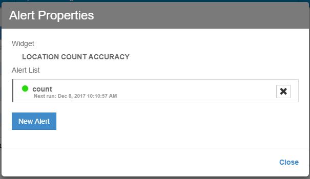 button. A dropdown menu appears.Select ‘Alerts’. The Alerts Properties dialog appears. The dialog shows all the alerts set up for this widget.