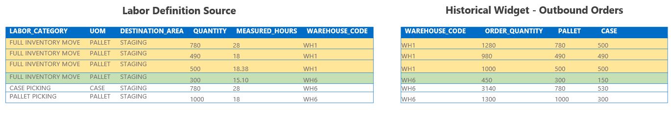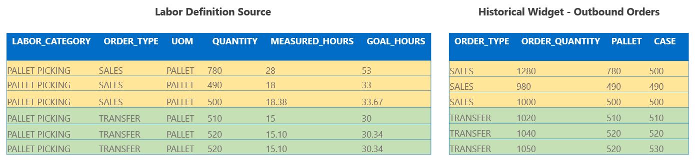 Puede asociar las actividades a su demanda utilizando uno o varios campos de atributos comunes que afectan el importe de los costes laborales. Por ejemplo, el almacén puede afectar la cantidad de costes laborales necesarios para completar una demanda. Considere el siguiente origen de la definición de trabajo y el widget histórico de pedidos de salida: