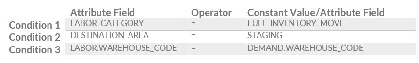 Como resultado, podríamos establecer la condición n.º 3 para asignar las actividades FULL_INVENTORY_MOVE a los pedidos de salida utilizando el campo de atributo WAREHOUSE_CODE: