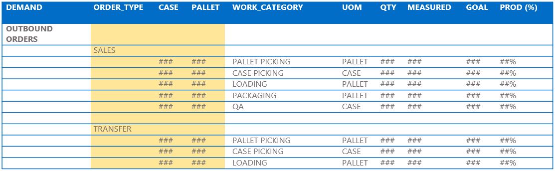 Rebus utiliza los campos de agrupación del tipo de demanda para determinar cómo se presentarán las cantidades futuras de demanda en la tabla de previsiones. En el ejemplo siguiente, las unidades (es decir, las cantidades solicitadas) son CASE y PALLET, y están agrupadas por ORDER_TYPE.