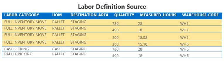Con los metadatos de trabajo, la Definición de trabajo determina cómo se presentarán los futuros costes laborales en la tabla de previsiones. En el siguiente ejemplo, los costes laborales se agrupan por WORK_CATEGORY, el campo UOM es UOM y el campo utilizado para calcular la cantidad del campo UOM es QTY.