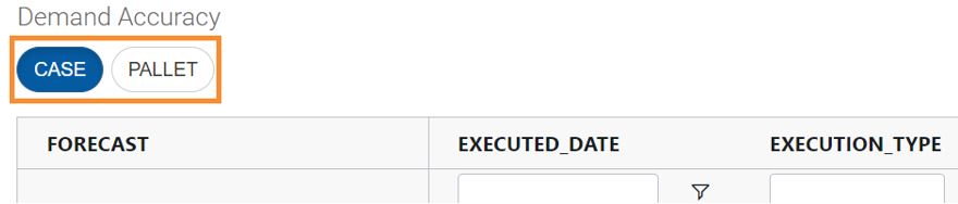 La tabla agrupa los resultados de precisión por instancia de previsión, Tipo de demanda y sus campos de salida de Tipo de demanda. Las instancias de previsión se identifican por su fecha de ejecución. En el ejemplo siguiente, los resultados se agrupan por la instancia de previsión PREVISIÓN 01, el tipo de demanda PEDIDOS DE SALIDA y el campo de salida ORDER_TYPE.