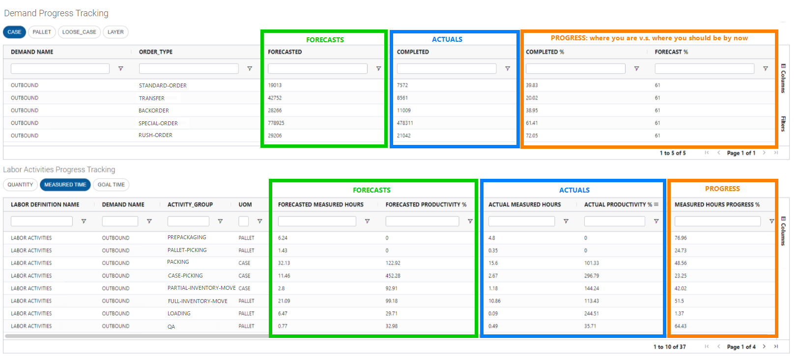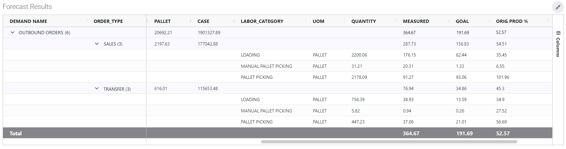 Basándose en tendencias históricas y en un modelo de previsión que usted construye, Rebus prevé costes laborales para una próxima demanda. Los costes laborales son las horas medidas y las horas objetivo para completar una actividad; una demanda es cualquier tipo de trabajo que requiere costes laborales del personal del almacén para completarse. Algunos ejemplos de demanda son los pedidos de salida, las recepciones de entrada, las órdenes de trabajo, la producción, las tareas dirigidas, etc.