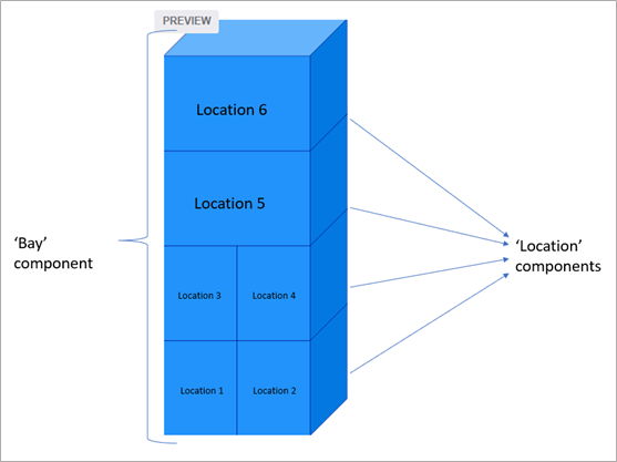 Cuando tenga componentes con diferentes dimensiones que desee utilizar repetidamente, puede crear cada componente una sola vez en Rebus. Consideremos el siguiente ejemplo de una bay con cuatro estantes y seis ubicaciones, donde las ubicaciones 5 y 6 son mayores que las ubicaciones 1 a 4. Para representar esto en Rebus, debe crear dos tipos de componentes con diferentes tamaños y utilizarlos repetidamente para crear el componente «Bay».