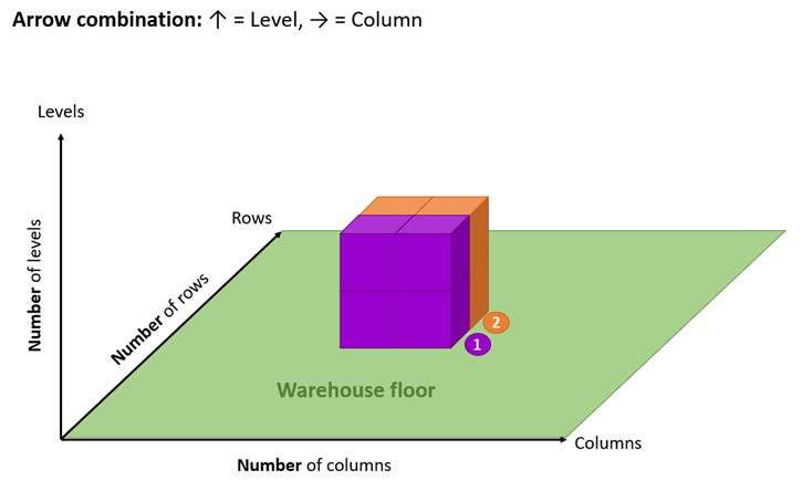 Una vez completada la asignación de valores en un lado de las ubicaciones apiladas, el proceso se repite en la tercera dimensión restante. Por ejemplo, considere la configuración de combinación de flechas ↑ = Nivel, → = Columna. Tras asignar valores a la cara frontal de las ubicaciones apiladas (cara n.º 1 en morado), Rebus repite el proceso en el conjunto de ubicaciones a una profundidad por detrás de la cara frontal (cara n.º 2 en naranja), siguiendo el mapa cartesiano de niveles, filas y columnas utilizado por Rebus. Para obtener más información, consulte ¿Cómo define Rebus un nivel, una fila y una columna?