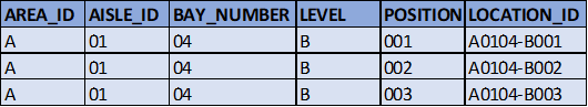 Por ejemplo, en la tabla siguiente, la convención de nomenclatura de las ubicaciones (es decir, LOCATION_ID en este ejemplo) consiste en concatenar AREA_ID, AISLE_ID, BAY_NUMBER, un guion, LEVEL y POSITION de la ubicación.