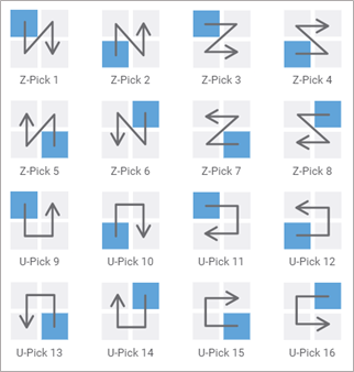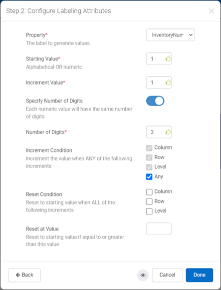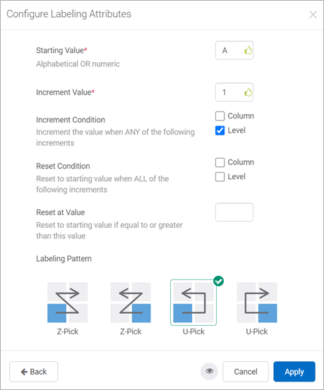 Una o más de las siguientes opciones para indicar cuándo se incrementa el valor: Columna: el valor se incrementa en la siguiente columna (dirección de izquierda a derecha). Fila: el valor se incrementa en la siguiente fila (dirección hacia arriba y abajo). Nivel: el valor se incrementa en el siguiente nivel (los niveles verticales de las ubicaciones). |