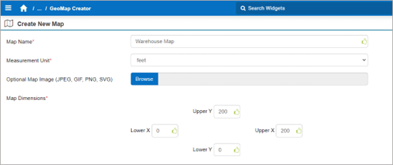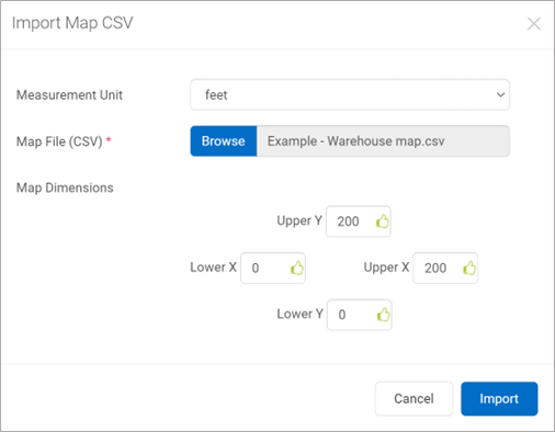 Complete los campos, incluidos Unidad de medida, Archivo de mapa (CSV) y Dimensiones de mapa.