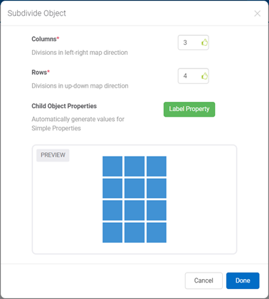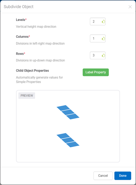 El número de niveles para apilar sus localizaciones. Nota: El campo «Nivel» solo está disponible cuando los objetos secundarios que desea crear pertenecen a la capa establecida como Ubicación. Para obtener más información, consulte Creación de capas. |