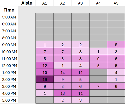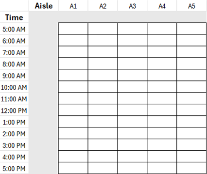 Create an excel sheet that lists the time of day on the Y axis and the Aisles on the X axis. Make sure you have the time slot for each aisle clearly outlined, and grey out any grid marks you do not want visible.
