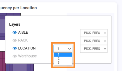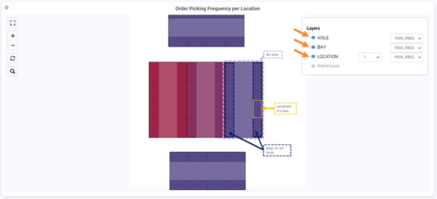 En este ejemplo, el widget de mapas de almacén se superpone a las capas LOCATION, BAY y AISLE. Como resultado, podemos ver las ubicaciones en cada bay, así como las bays en los pasillos.