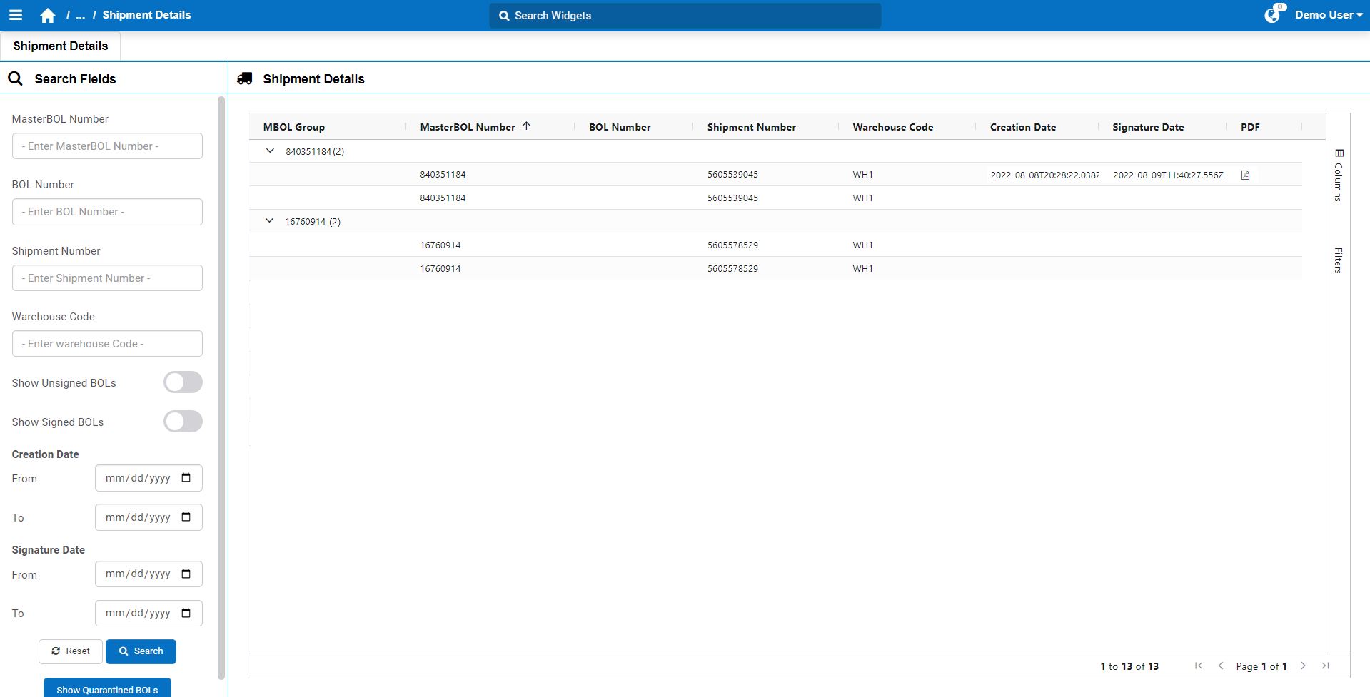 La pantalla Detalles del envío le permite ver los registros de los BOL que se generaron a partir de los datos de Rebus. Sin embargo, puede exportar un BOL como PDF solo después de que se haya firmado y la copia firmada se haya almacenado en Rebus.