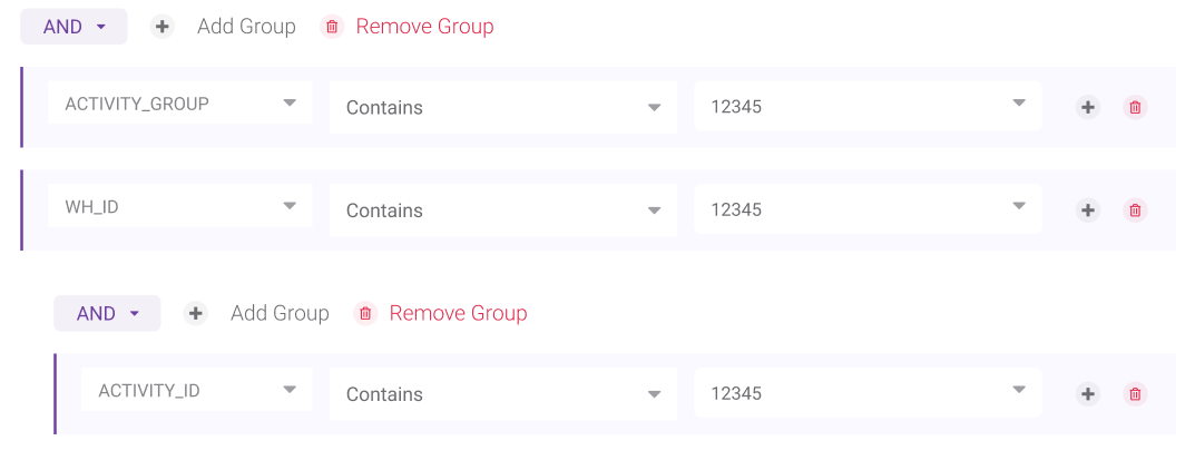 Adding a Group of Conditions: If you’re appending this group to a previously created condition or group, select either the ‘AND’ or the ‘OR’ logical operator from the dropdown in the group’s upper left. Then click ‘Add Group’. Another line of ‘Add’ and ‘Remove’ buttons appears. You can now add conditions or groups to the new group.
