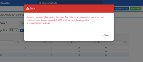Al añadir, importar o modificar ubicaciones y pasillos en la funcionalidad Distancia de recorrido, la diferencia entre los valores mínimo y máximo de las coordenadas x e y ya no puede superar las 3000 unidades. Esta actualización garantiza que los pasillos se mantengan dentro de unos límites espaciales razonables y evita que se añadan o modifiquen zonas excesivamente grandes. Anteriormente, la asignación de un valor demasiado grande provocaba problemas de procesamiento en el plano de viaje. Si se introducía un conjunto de coordenadas que no cumplía los criterios, aparecía un mensaje de error.