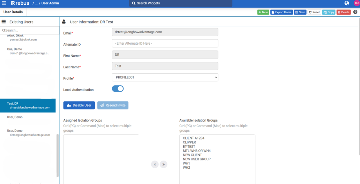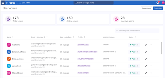 La parte superior de la pantalla incluye ahora los recuentos de Usuarios Totales, Activos e Inactivos. Antes había que exportar un archivo CSV de usuarios para obtener esta información. También dispone de una nueva columna de Última fecha de inicio de sesión para que pueda ver fácilmente cuándo fue la última vez que los usuarios iniciaron sesión en Rebus, así como quién ha sido invitado a Rebus pero aún no ha iniciado sesión. Si un usuario aún no ha iniciado sesión, se mostrará «No ha iniciado sesión» en lugar de una fecha. En la Lista de usuarios: