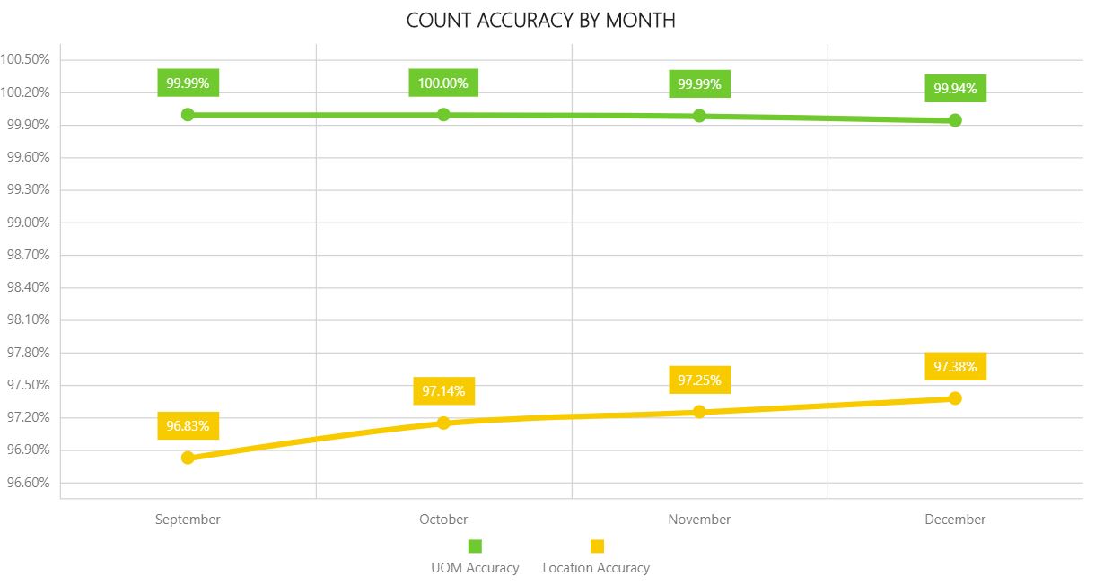 Muestra la tendencia de la precisión del recuento mes a mes. Una línea representa la precisión del recuento de la UOM y la otra representa la precisión del recuento de la ubicación.
