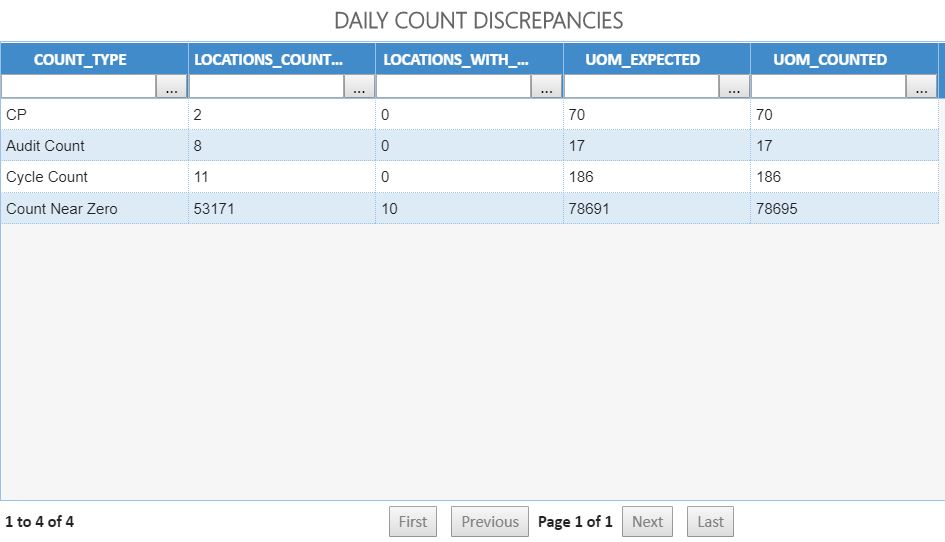 Muestra los totales de la cuadrícula de las ubicaciones contadas, las ubicaciones con discrepancias, la UOM esperada y la UOM contada.
