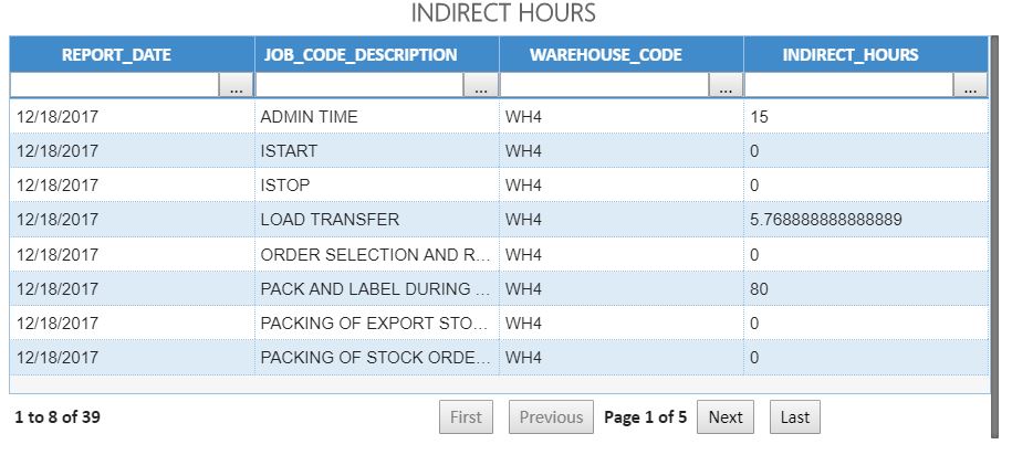 Muestra la cantidad de horas indirectas dedicadas a cada tipo de actividad no medida en un almacén concreto durante un intervalo de fechas especificado.