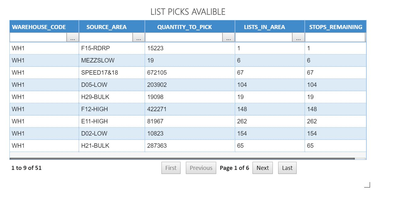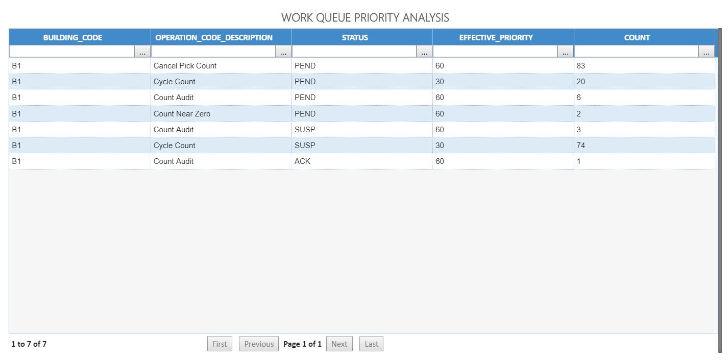 Muestra los detalles de la cuadrícula de los tipos de trabajo por estado y código de operación dentro de un almacén.