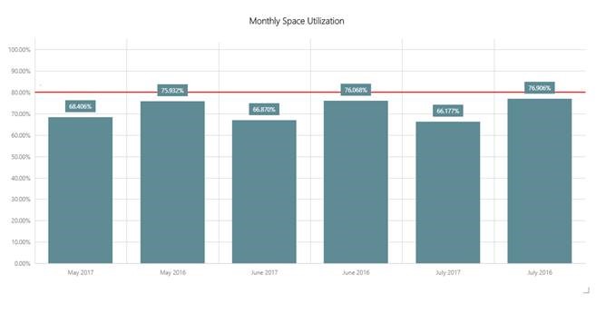Muestra la utilización del espacio en el almacén de mes a mes.