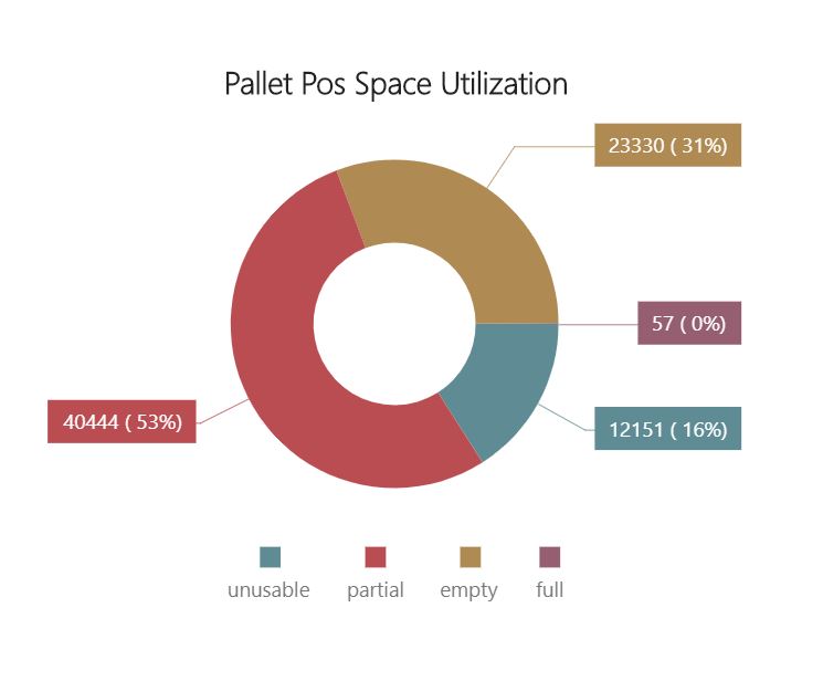 Un gráfico circular que permite comparar cuántas ubicaciones del almacén están llenas, vacías, parcialmente llenas o no se pueden utilizar. Para ver el número de ubicaciones en un estado concreto, pase el mouse por encima del segmento del gráfico.