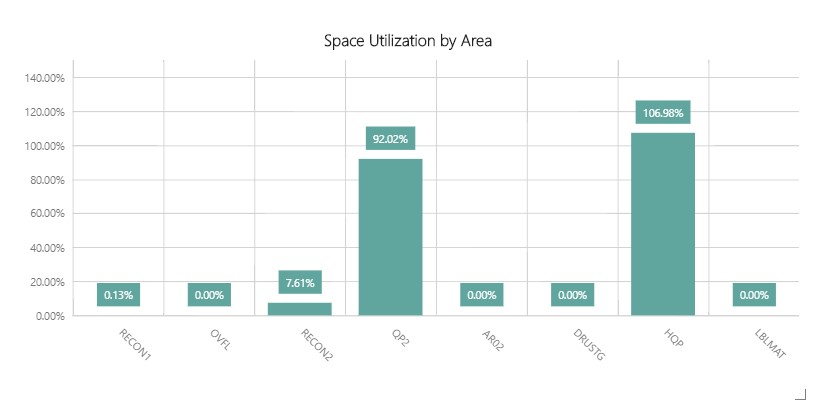 Para cada área del almacén, muestra el desglose actual de la parte que está llena, vacía o parcialmente llena.