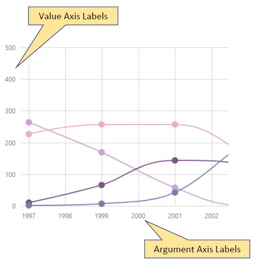 Especifica el tipo de valores del eje deseado. El tipo de los valores del eje se determina en función del tipo de los valores especificados en el campo de la fuente de datos correspondiente de la serie del gráfico. Si los argumentos se especifican como valores numéricos en una fuente de datos en serie, los valores del eje de los argumentos también serán de tipo numérico. La misma lógica se utiliza cuando se especifican argumentos de cadena o de fecha y hora en la fuente de datos. En algunos casos, es posible que necesite que el tipo de los argumentos que se especifican en la fuente de datos se convierta a otro tipo.