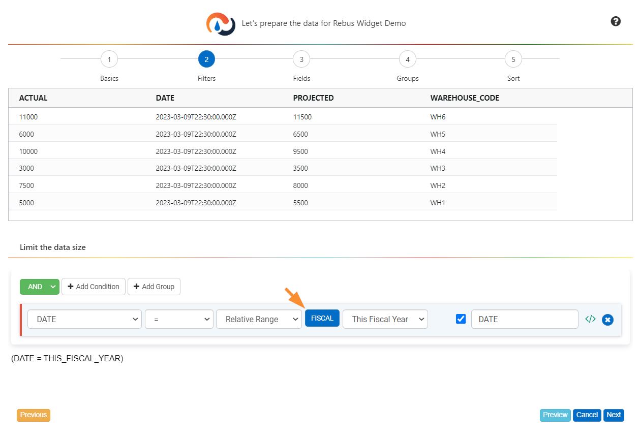 En el siguiente ejemplo, prepararemos los datos para un widget que muestra un recuento de todos los pedidos de la semana pasada que tuvieron una SHIPPED_QUANTITY superior a 100. El recuento se desglosará por fechas:
