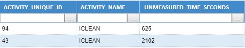 La creación de un widget que sume los UNMEASURED_TIME_SECONDS para esta muestra de datos dará como resultado valores excesivos, ya que la medida de toda la actividad se suma dos veces. El total de UNMEASURE_TIME_SECONDS para la actividad ICLEAN devuelve 5454 segundos en lugar de los 2727 segundos esperados.
