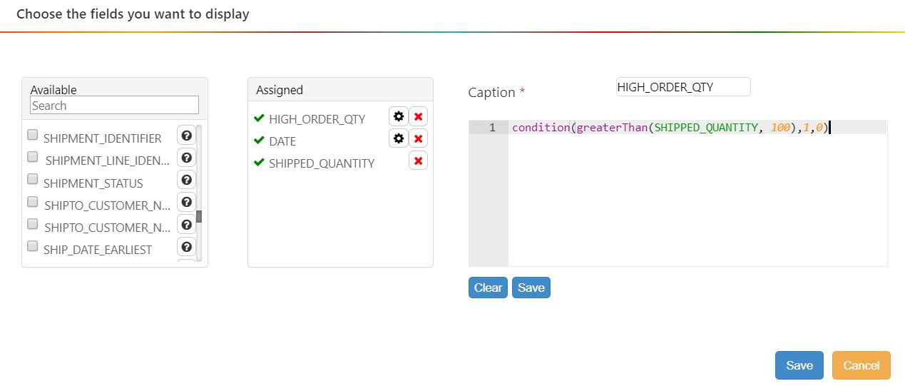 En la etapa Selección de los campos de visualización, configure un campo calculado denominado “HIGH_ORDER_QTY” que tenga una función condition que devuelve un «1» si la SHIPPED_QUANTITY del pedido es superior a «100» y «0» en caso contrario: