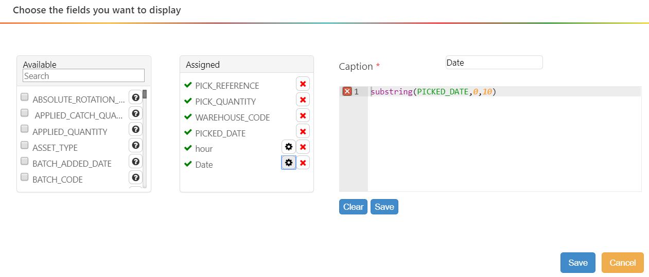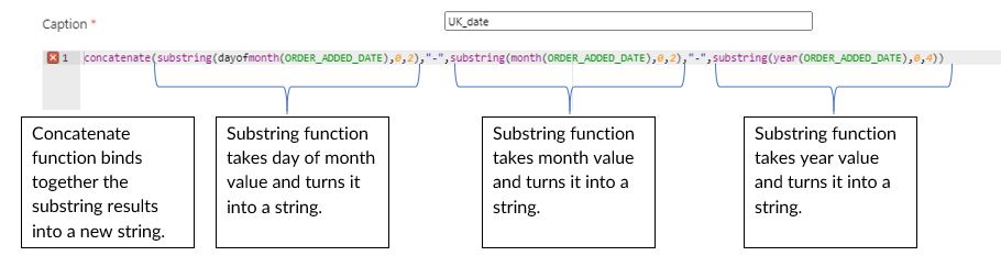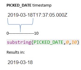 En la etapa Selección de los campos de visualización, configure un campo calculado que utilice la función substring para obtener los 10 primeros caracteres del valor del campo de fecha. En el conjunto de datos, el campo calculado de cada registro muestra la fecha del día tomada de la marca de tiempo del registro. En el siguiente ejemplo, utilizamos la función substring para crear un campo calculado que tenga solo los valores de día, mes y año del campo PICKED_DATE: