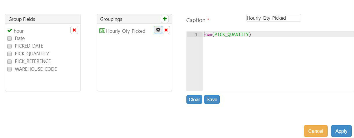 En la etapa Agrupación de datos, agrupe los registros según el campo calculado que muestra el día-mes-año. Agregue otro campo calculado que utilice la función sum() para devolver la suma de todos los valores numéricos del campo especificado. En el ejemplo siguiente, mostramos la cantidad de recogida por día: