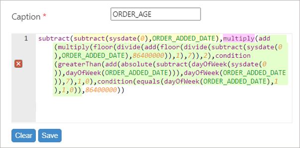 La subexpresión «condition(greaterThan(REMANING_DAYS_BETWEEN,7),1,0)» se utiliza para que, si además de las semanas completas, se comienza un viernes, sábado o domingo, se agregue 1 para tener en cuenta el comienzo del día que cae en una fecha de fin de semana.