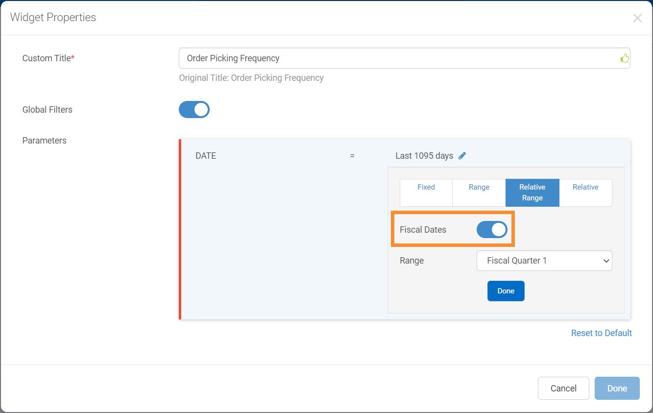En el creador de widgets, puede crear widgets que utilicen la fecha del sistema del WMS como parte de la consulta que rellena el widget. Dos funciones, sysdate() y sysdatetz(), devuelven la fecha actual del sistema del WMS o una fecha en relación con la fecha del sistema. Puede utilizar la salida de estas funciones como argumentos para otras funciones que toman argumentos de fecha.
