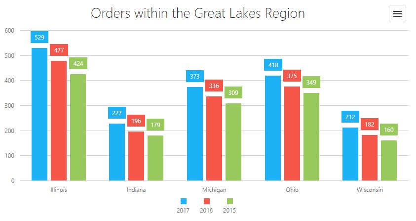 Los gráficos de barras permiten comparar fácilmente los valores. Los gráficos de barras apiladas lo ayudan a ver varias series y a compararlas. Los gráficos de barras apiladas completas le permiten comparar el valor porcentual de varias series de áreas para cada argumento.