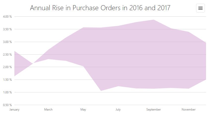 Los gráficos de áreas de distribución muestran intervalos de valores. Los datos se muestran como un espacio relleno de color entre la línea que une los puntos de la serie inicial y la línea que une los puntos de la serie final.