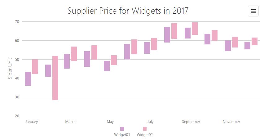 Las barras de intervalo muestran los intervalos de valores correspondientes a los argumentos especificados. Los datos se muestran como conjuntos de barras rectangulares que comienzan en el valor inicial especificado y terminan en el valor final especificado.