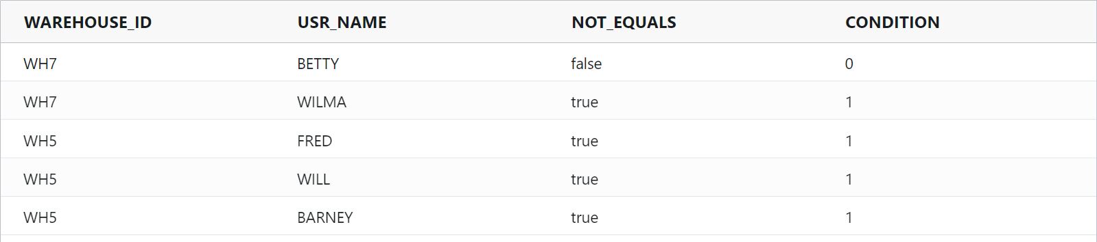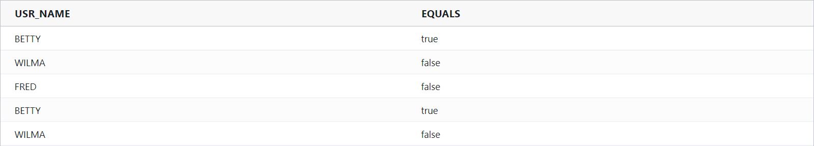 equals : Compares two values and returns: ‘true’ when the values are equivalent. Otherwise, ‘false’.