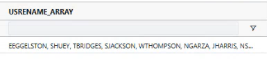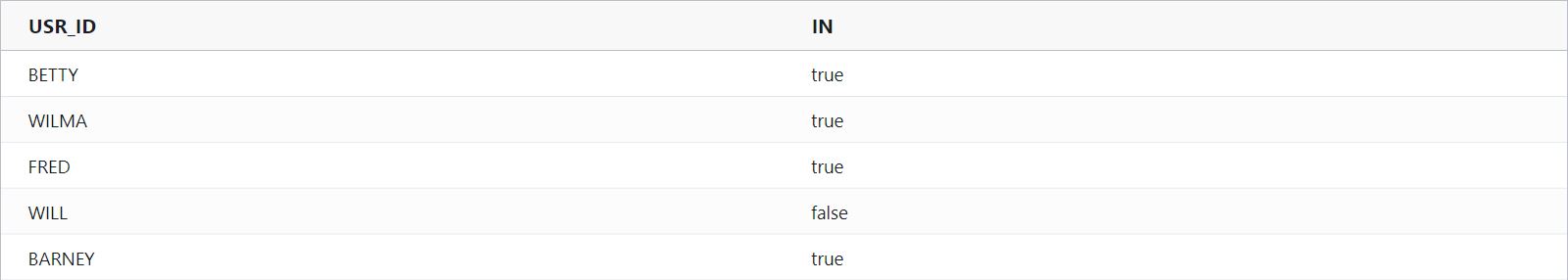 Each value should be enclosed in double quotes. Format: in (FIELD_VALUE_TO_TEST, [“ArrayElement1”,”ArrayElement2”]). To aggregate the true/false results, embed the in function inside the condition function and wrap the condition function inside the desired aggregation function. In the example, the condition function returns a value of 1 if USR_ID equals either «WILMA», «BETTY», «FRED», or «BARNEY»; otherwise, it returns a value of 0. The expression then sums the records that meet the specified condition.