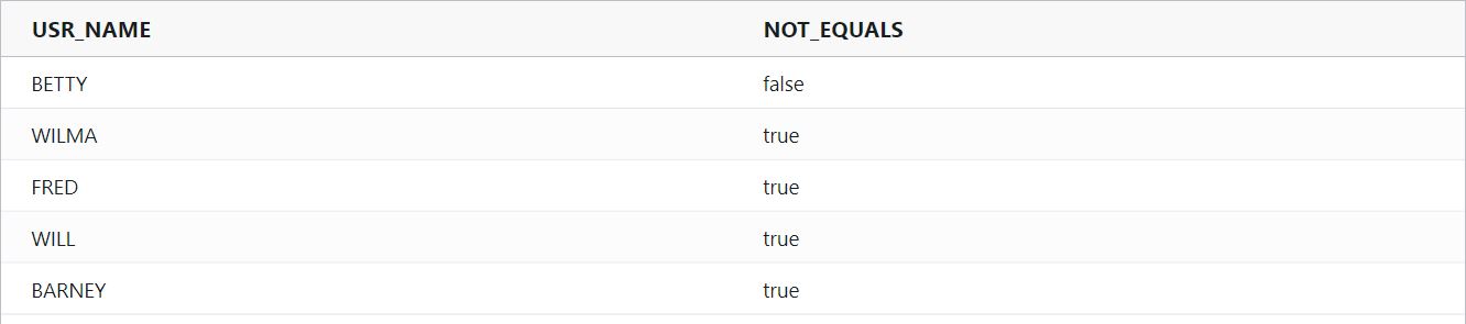To aggregate the true/false results, embed the notEquals function inside the condition function and wrap the condition function inside the desired aggregation function. In the example, the condition function returns a value of 1 if USR_ID does not equal «BETTY»; otherwise, it returns a value of 0. The expression then sums the records that meet the specified condition.