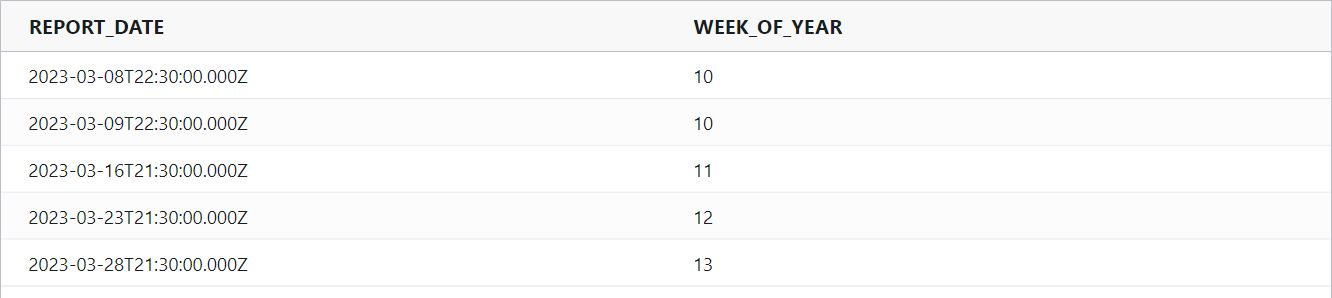 weekOfYear : Returns the week of the year for a date as a number between 0 and 53.