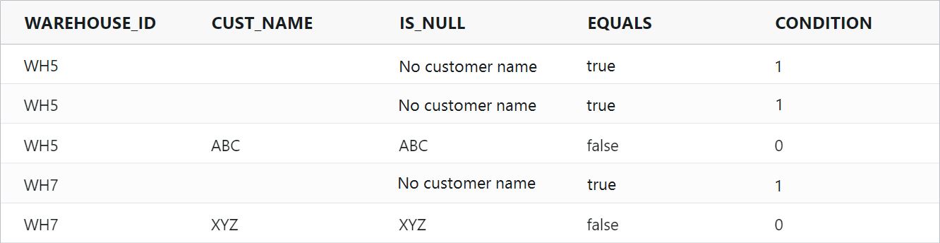 If the expression evaluates to a null value, including instances of undefined values or missing fields, returns the value of the replacement expression. In the example, the isNull function returns the value «No customer name» if CUST_NAME of a record stores a null value. The condition function returns a value of 1 if the record has a value equal to «No customer name»; otherwise, it returns a value of 0. The expression them sums the number of records that meet the specified condition.