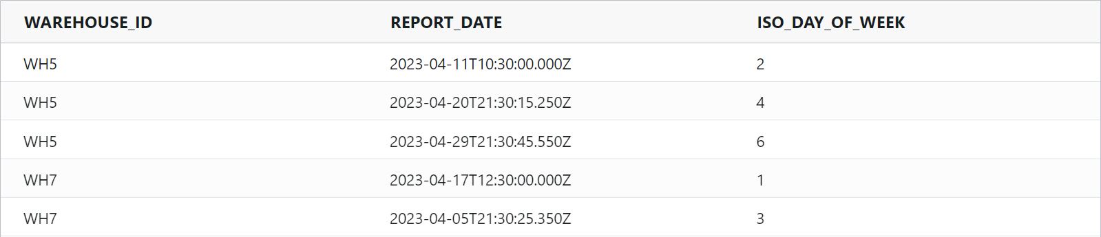 isoDayOfWeek : Returns the weekday number in ISO 8601 format, ranging from 1 (for Monday) to 7 (for Sunday).