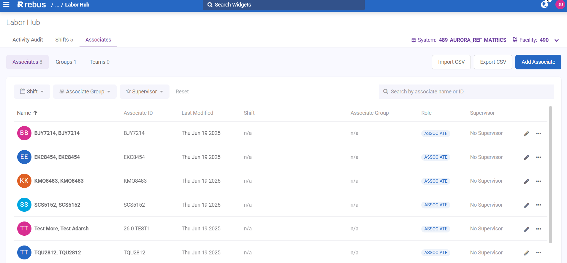 The default system and facility ID will be automatically chosen on every labor module screen. This includes the following pages: Activity Adjustment Admin, Activity Configuration Admin, Activity group Details, Activity Log In, Labour Associate Admin, Labor Associate Group Admin, Existing Shifts, and Transaction Error Review.