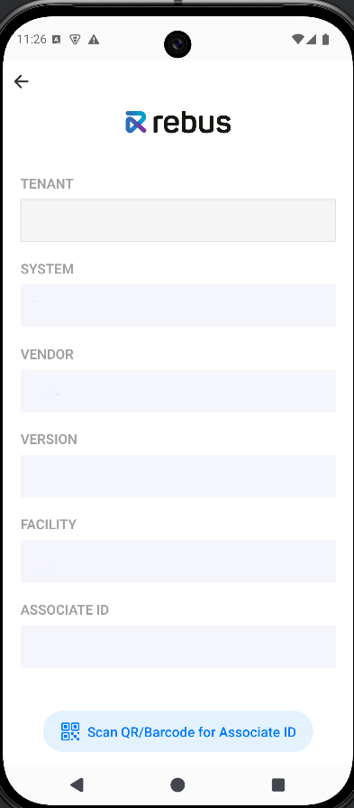 When you open the app, enter your credentials to sign in. You can either enter credentials manually, or by scanning a barcode provided by your facility that will automatically enter your details. You can generate a barcode from the Associate Portal screen, or from the Associates screen in Labor Associates when selecting a System and Facility.