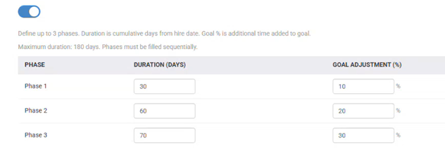 Learning Curve timelines are calculated based on number of days from Hire Date. You can configure 1 to 3 phases per Activity. Each phase applies an adjustment (+X% of goal value) to expectations. Phases are standardized and named: