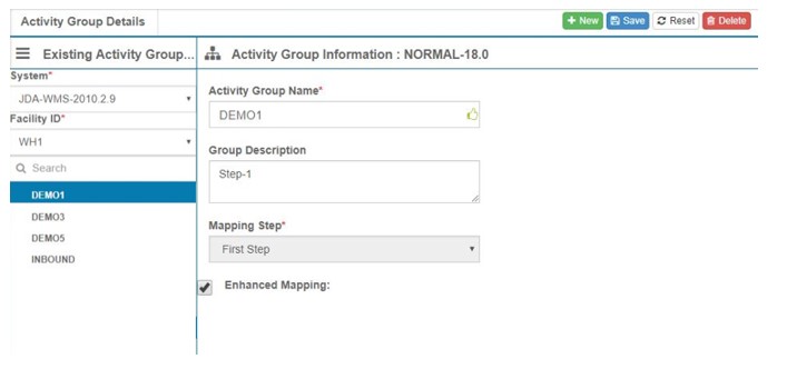 You can now create more flexible mapping schemes when setting up an activity group for the labor module. The new Enhanced Activity Mapping functionality lets you set up conditions for up to 20 ‘AUX’ fields to map WMS transactions to activity types.