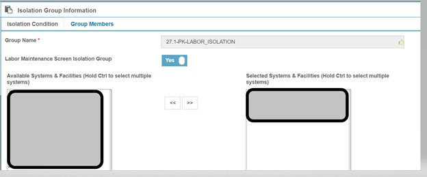The isolation group is saved with a list of systems and facilities and a list of members. Members of this isolation group can view only the selected systems and facilities when using the Labor Maintenance Screens.