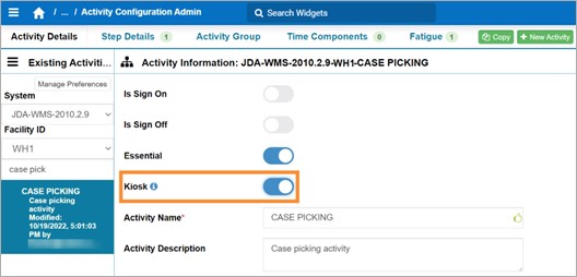 To allow labor users to log essential activities into the Activity Log In screen, ensure that the ‘Kiosk’ toggle is turned on in the respective Activity Type: